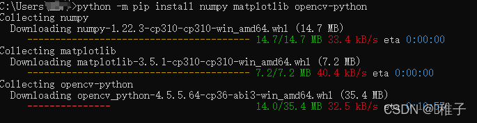 使用命令:python -m pip install numpy matplotlib opencv-python