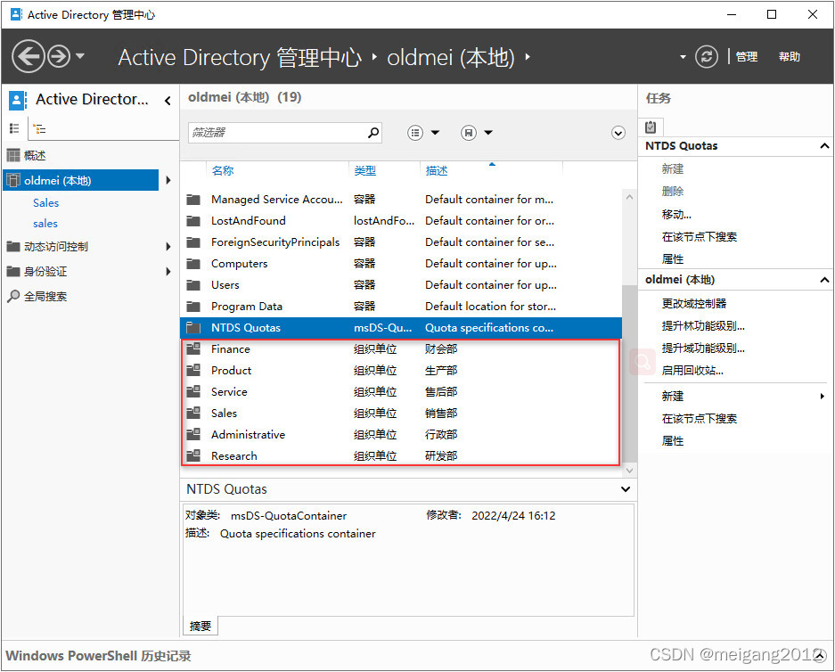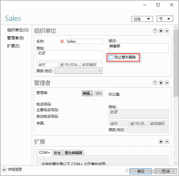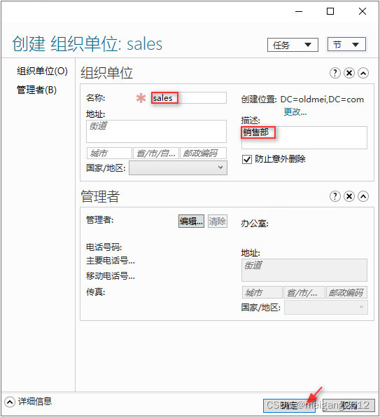 4 插入组织单位的名称,根据目前的业务结构,我们可以建立组织单位。视设备类型而定,也可以建造组织单元。除其他外,这预先假定公司设有行政、财务、采购和销售部门。记住,组织单位的名称最好使用英文。由于DC=oldmei的位置,DC=com等,都是用英文描述,在描述中,您可以使用中文。默认情况下, 启用 [以避免无意删除],因为组织模块下面有很多事情要做这样可以防止错误地删除集团单位。