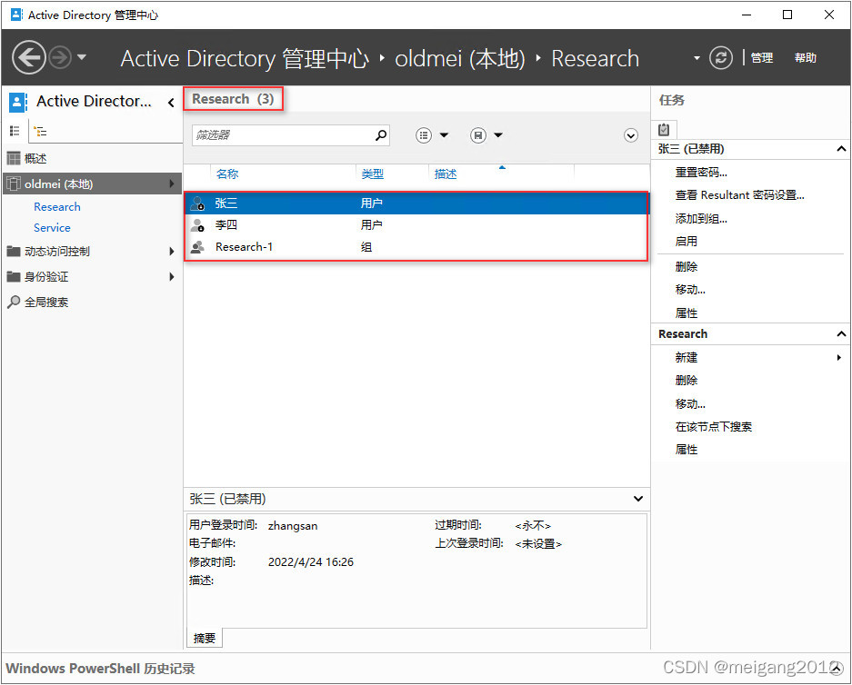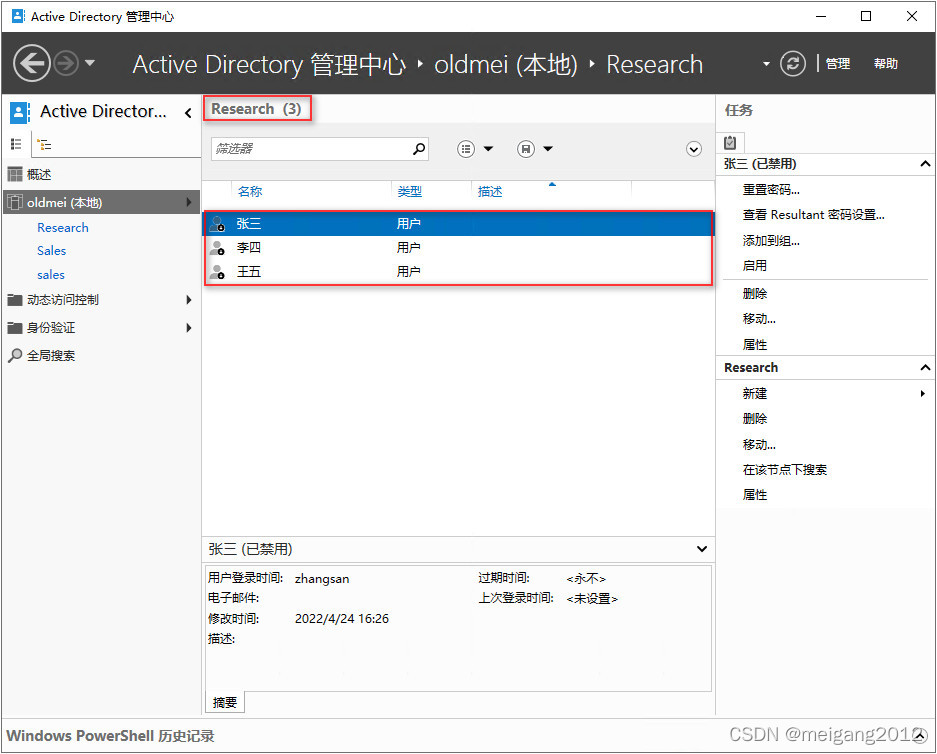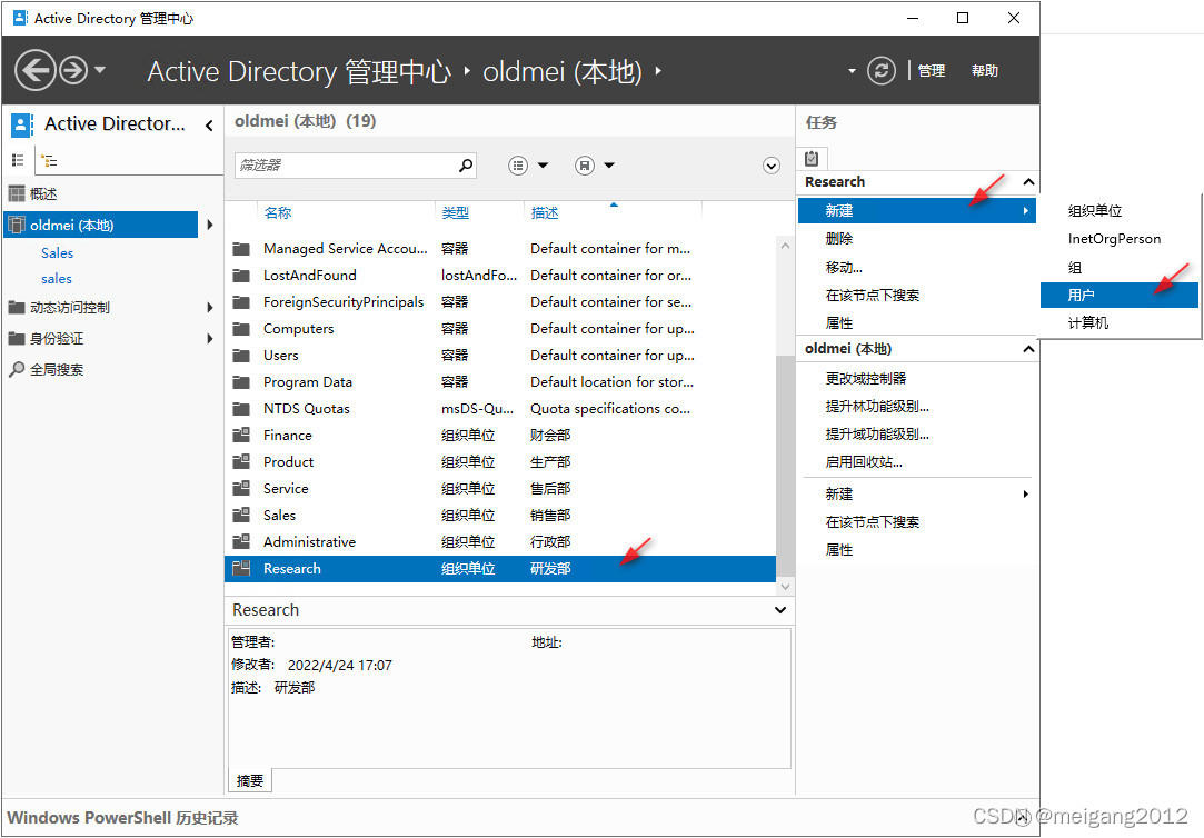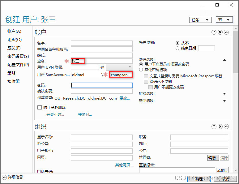 1 根据实际的公司环境,张三在开发部工作,我们应该把张山纳入研究和发展部的组织结构。• 选择研究和发展部组织单位。从正确的菜单中选择 [新 。点击【用户】。请注意,上面显示的“新”菜单是一个组织单位。以下菜单代表一个域名。不要搞混了。