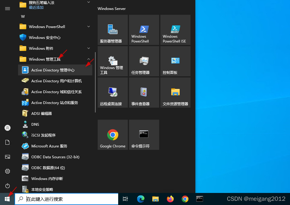 1 登录到 Windows 服务器 2022, 单击 启动 按钮, 然后从弹出菜单中选择 [窗口管理工具] - [辅助目录管理中心] 。