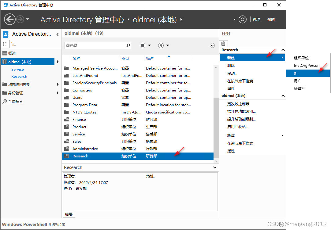 ① 和新建用户一样,首先• 选择研究和发展部组织单位。选择右上菜单【新建】-【组】。