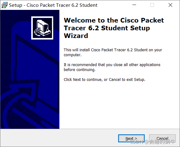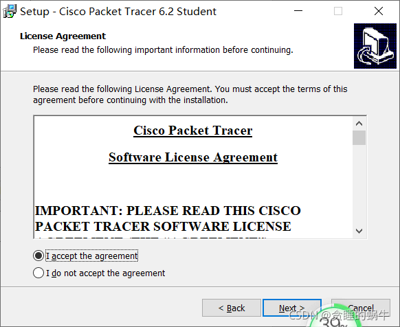 I. 获得Cisco Packet Tracer 6.2网络模拟软件包的正式版本,该软件包可以Zip格式下载和接收。压缩 包,使用鼠鼠右键选择压缩软件包 解压 在当前目录中,进入文件夹,双击 Cisco Packet Tracer 2 双击 Windows 学生版( 无教程) 以启动它 。点击Next。
