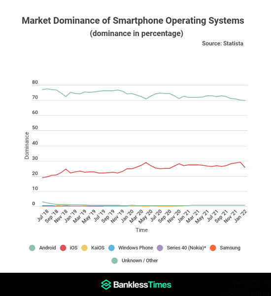 根据StockApps上公布的数据2018年7月,Android占移动操作系统市场的32%。创下历史新高,不过到2022年1月其市场份额现在为69.74%。换句话说,在不到四年的时间里,机器人的全球市场份额下降了7.58%而作为对比,2018年7月至2022年1月,iOS的市场份额增加了约6%。前19.4%增加到25.49%。