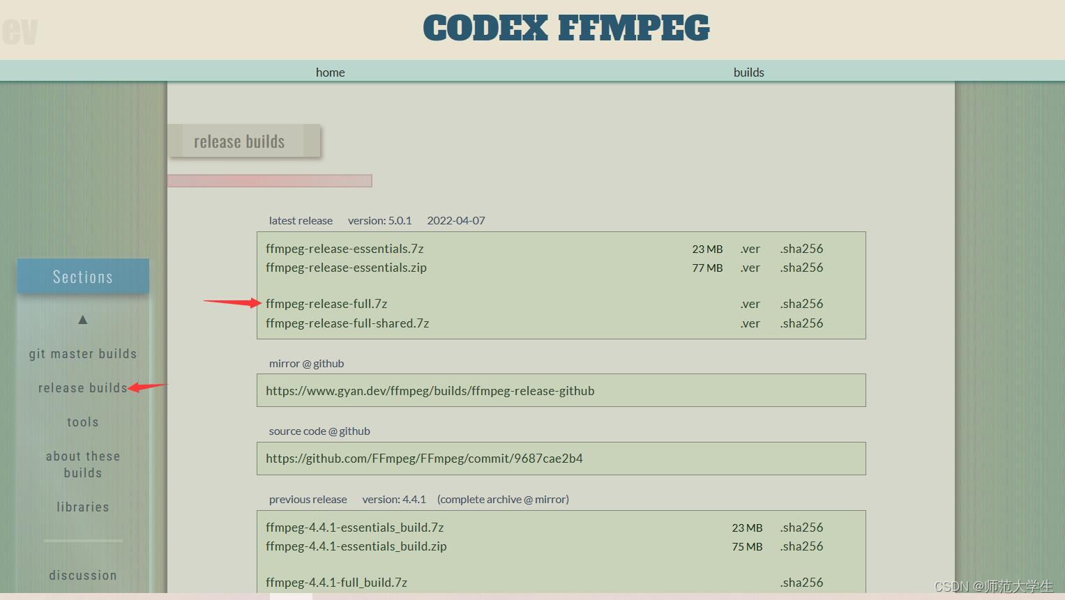 在版本的左侧 build.7z, 选择当前最新的发行版本, ffmpeg- release- full, 并通过浏览器下载 。