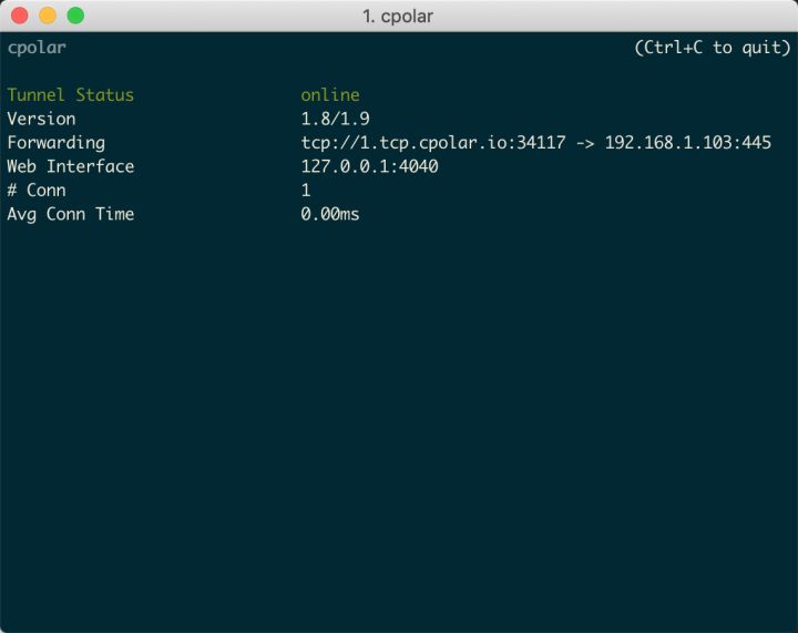 当 cpolar 显示上述反馈时,它意味着我们的北极圈已经成功接触。记下来,在圆极中,我们输入命令 "collar tcp: 445"。极地将创造必要的数据隧道