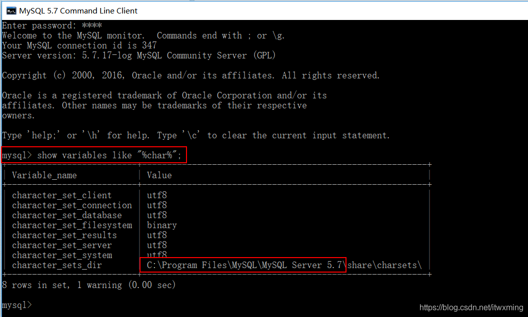 登录到 MySQL 客户端, 然后输入命令 : 罐头如何如“ 字符 ” ;