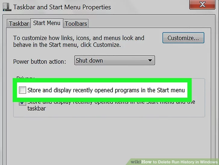 6再次检查“ 存储器最近打开程序” 框。 再次单击复选框以重新检查它。 您的运行历史现在应该是空的 。