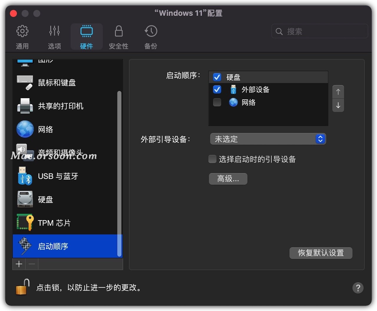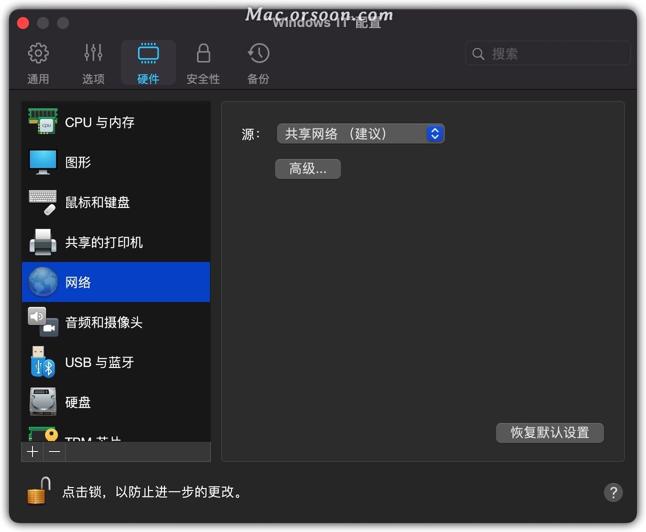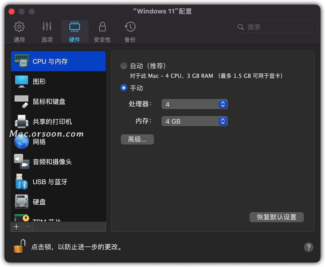 10、然后点硬件,点CPU与内存,这取决于计算机硬件设置。我这台是苹果M1,只有8核的处理器,8G的内存,本着对半分的原则,我给了虚拟电脑4个核电联和4千兆字节的内存这样做是不可行的,因为PD方案还要求Mac系统具有适当的性能。Mac系统一半的CPU和内存仍然负担得起。如果你的电脑更强大可以多分一点。如果你的处理器有六个核心建议将其分为两个或四个部分。三点分立将是一个系统性问题。也就是说,在CPU核心中不应出现奇数。