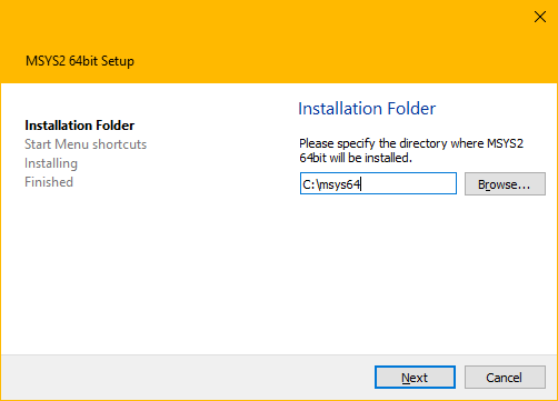 2.Run the installer. MSYS2 requires 64 bit Windows 7 or newer.