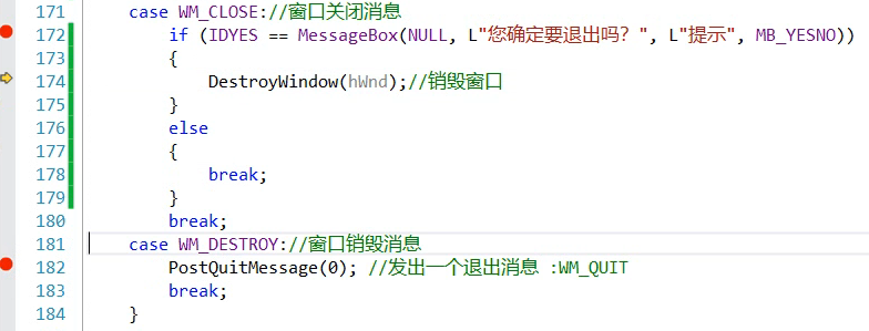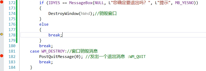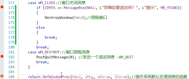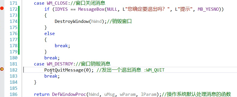 不论是否叫出退出,将执行以下声明:return DefWindowProc(hWnd,uMsg,wParam,lParam);