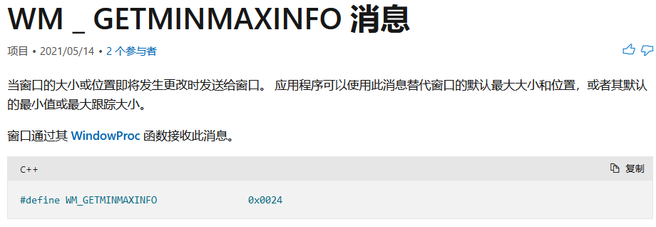 WM_GETEMINMAXINFO 电文 (Winuser.h) - 微软文档 Win32 应用程序