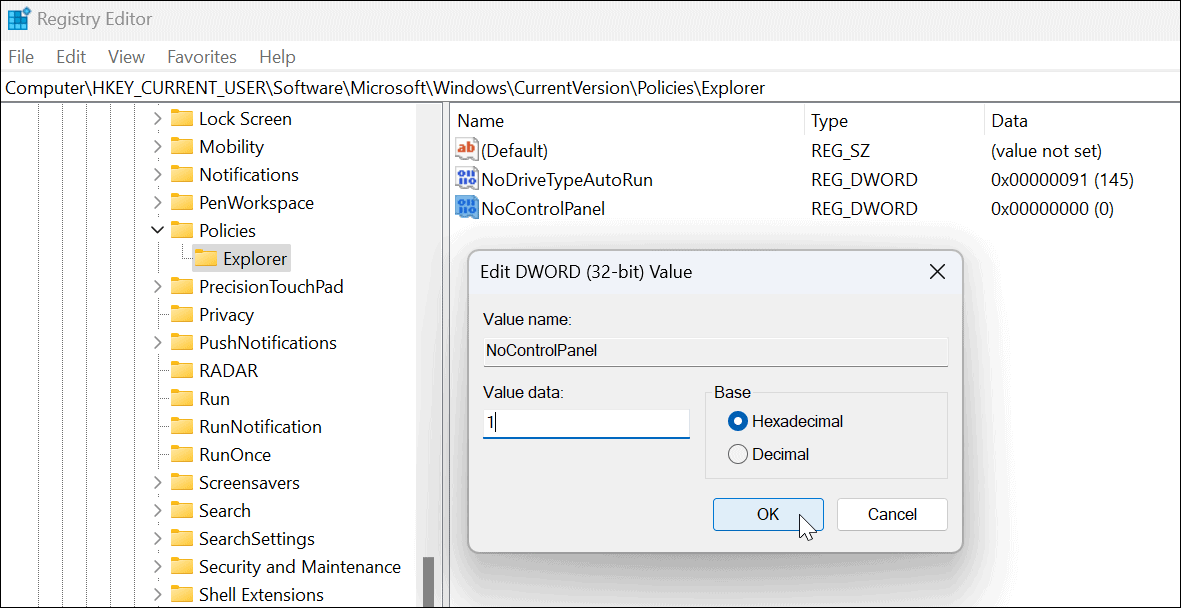 HKEY_CURRENT_USERSoftwareMicrosoftWindowsCurrentVersionPoliciesExplorer