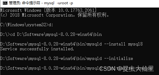 再输入命令 cd D:Softwaremysql-8.0.28-winx64bin