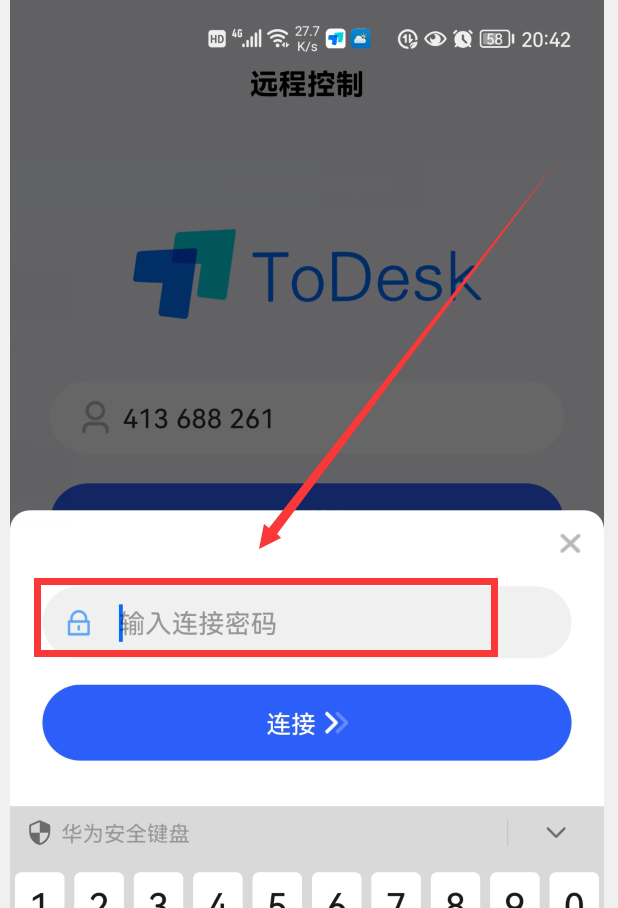 在输入框中输入“远程设备代码”,这是另一个手机的代码。然后单击“远程控制”按钮,该按钮将弹出一个窗口,并促使我们输入“连接密码”,即另一个手机对台的首页提供的“临时密码”。