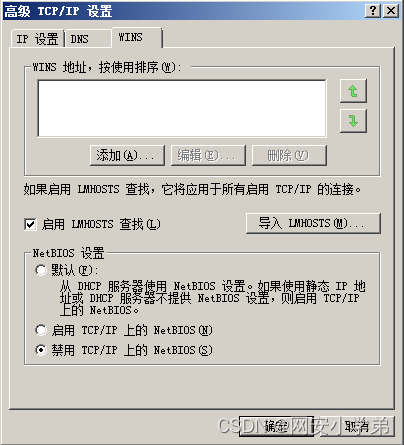 关闭监听UDP 137(网生生物-ns)、UDP 138(网生生物-dgm)和TCP 139(网生生物-sn),并取消关于TCP/IP的网络BIOS协议。
