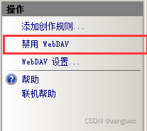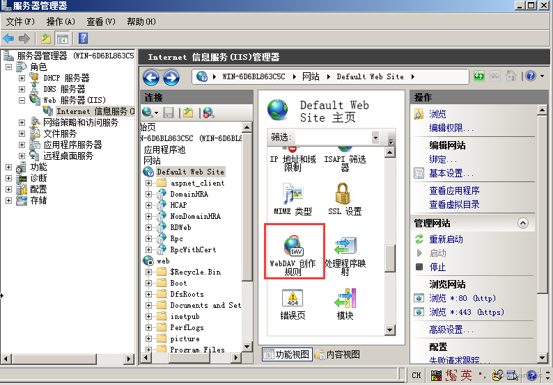 打开 IIS 管理,选择 [网站,单击 [默认网站],单击 [WebDAV 创建规则],然后单击右边的 [禁用 WebDAV] 按钮。