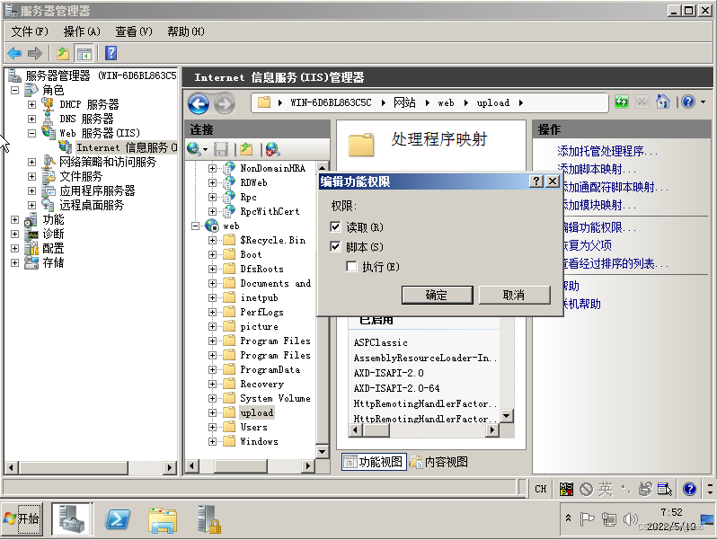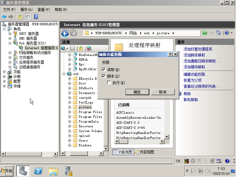 打开 IIS 管理器, 点击 [web], 点击 [web], 点击图片/加载, 点击程序程序图, 右键点击修改权限, 并取消执行选择 。