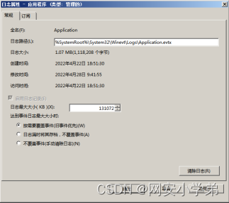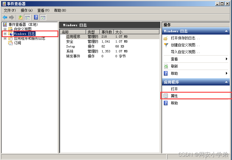 路径:按下 Win 键,将指针拖到 [管理工具],选择时间查看器,输入 [窗口日志],然后单击右边的属性按钮。