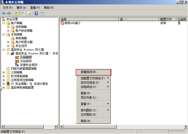 路径: 转到[ 本地安全策略], 单击 [高级安全窗口防火墙- 本地组战略对象], 单击[ 输入规则], 右键单击空白框, 并选择 [新规, 然后根据需要进行调整 。