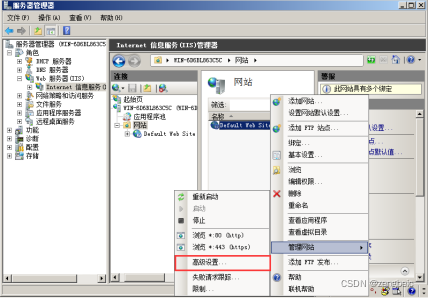 打开IIS管理器,单击[网站],右键点击[默认网站],点击[管理网站],然后点击[高级选项]。