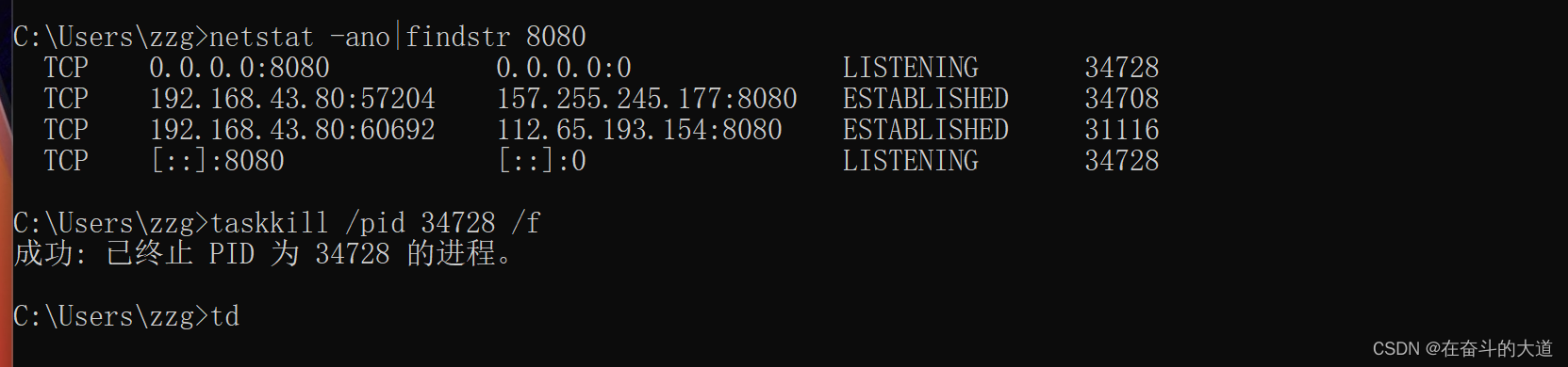 1. 在Windows指挥部窗口,型号为Netstat-nofindstr 8080。