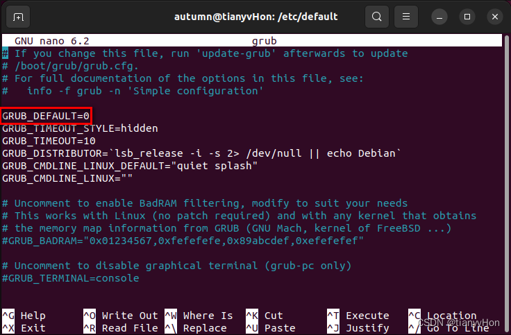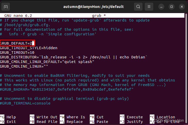 GRUB_DEFAULT=0,将0更改到您想要修改的序列号, 就像我所做的那样 。2