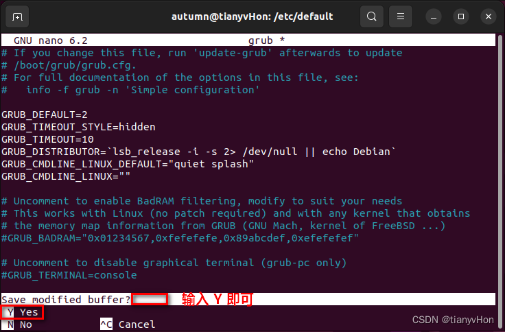 ctrl + X,然后在保持鼠标的同时浏览到下面的界面。Save modified buffer?后,我们紧接着键入Y,即保存配置