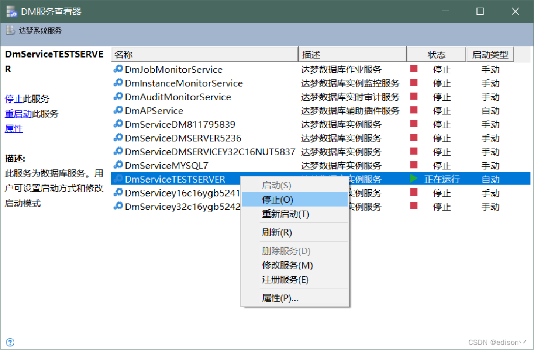 systemctl start/stop/status DmServiceTEST.service