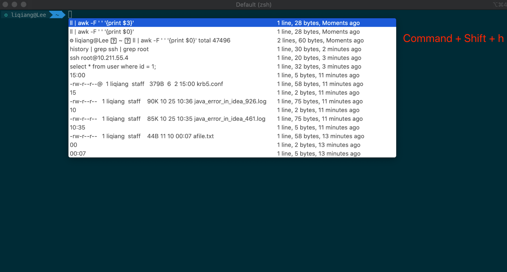命令建议, 其中可以提醒最近的输入以及典型的命令; 必须指出, 这里输入的只是内容, 尽管 iTerm 有一个完整的命令插件, 且该插件会详细化 。