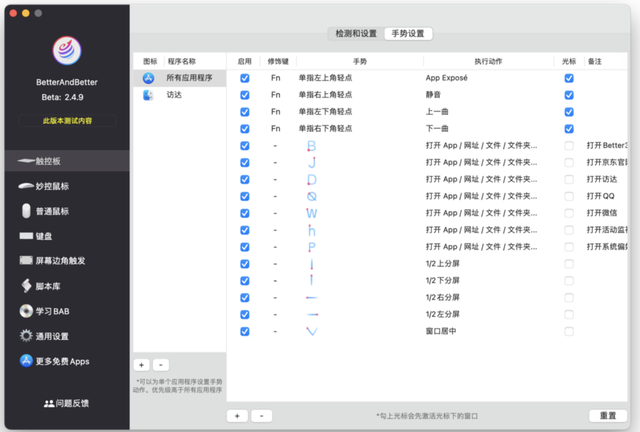 例如,Fn+单指光点可以设定为安静点,左下角和右下角可以设定为多媒体控制点,等等。