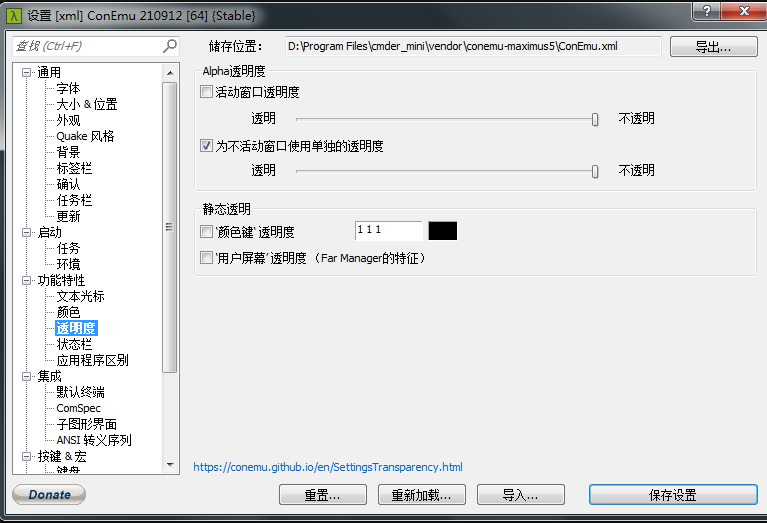 这样菜单就会变成中文。 此外,cmder默认的透明度为一定。 透明度方法如下