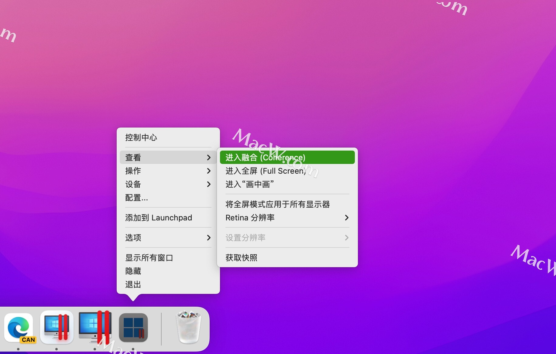 平行桌面虚拟机在融合模式中,win上的软件可以在Mac上的窗口模式中运行。 如何在安装Windows在pd虚拟机后退出(进入)融合模式?