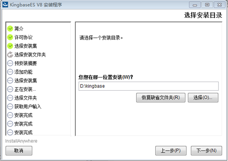 在安装KingbaseES V8安装包时,选择默认路径以外的空文件夹(桌面或D-disk):