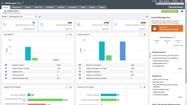 ADManager Plus具有简化和完整的GUI和AD域管理和报告功能,是复杂的和繁琐的Active Directory工具和PowerShell脚本的简单和有效的替代品。