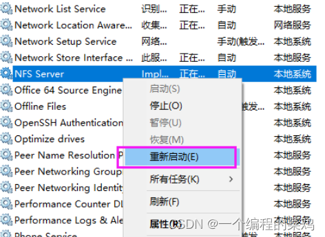 5.右键此电脑->管理->服务->找到NFS server ,右键重新启动