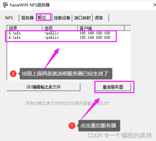 6.重新启动NSFS服务器后,再次单击NFS重新启动服务按钮,此时,中间的配置发生了变化,下面的配置显示了nfs服务已经打开,如果你想修改nfs的共享目录,你可以按照第3步的步骤,在出口中修改