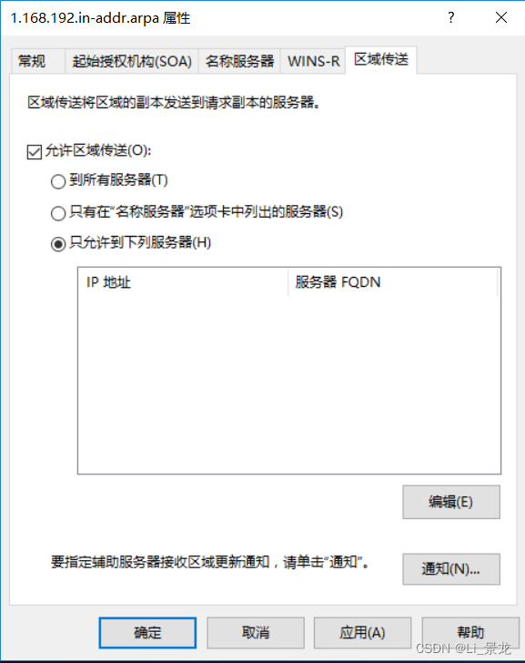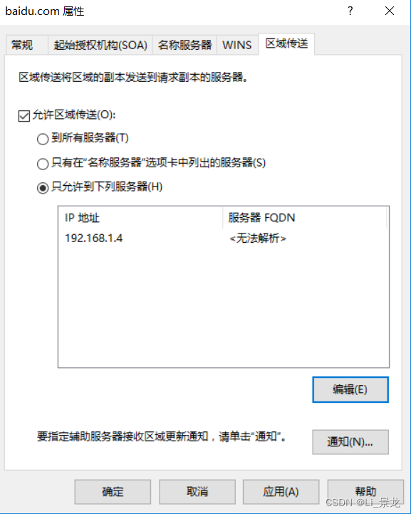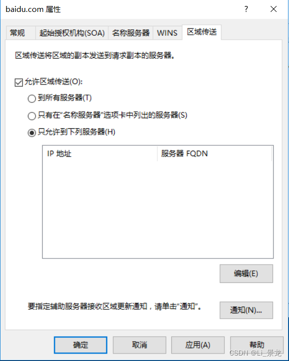 - 在baidu.com属性控制面板中,选择区域转移选项卡,并选择仅允许以下服务器选项。