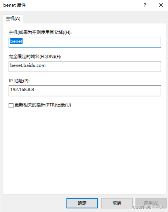 - 通过上述方法,添加另一个主机,命名为: benet,IP地址:,并不要选择创建相关的指针。