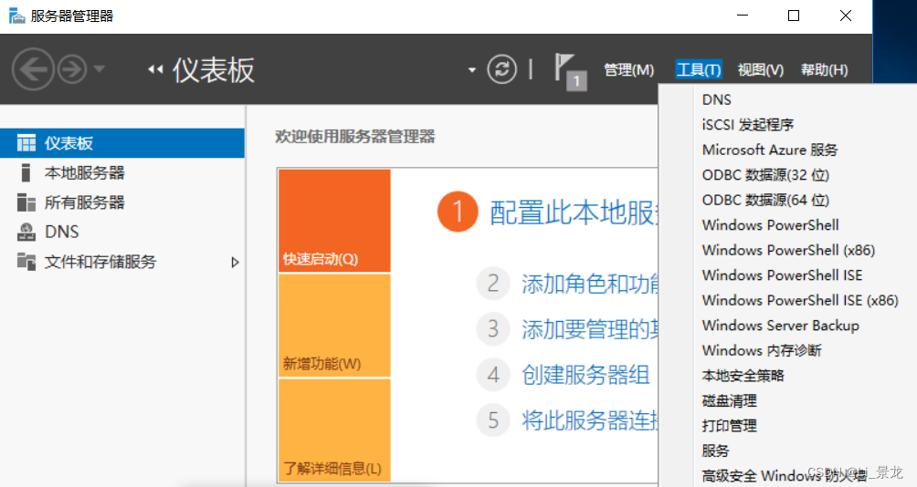 - 在服务器管理器控制面板下的工具的下落列表中找到DNS并打开它。