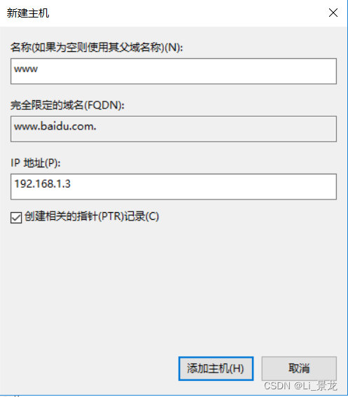 - 在弹出对话框中,输入名称: ww,IP地址:,并选择创建相关的指针PTR记录,并单击添加主机。