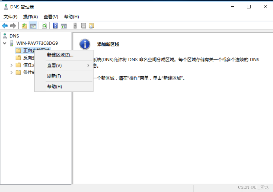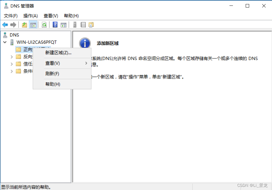- 在“WIN-UI2CAS6PFQT”下选择右搜索区域,然后右击“新区域”。