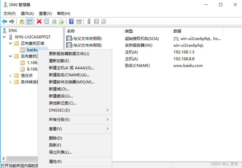 - 右击baidu在主DNS控制器上。 在弹出菜单中,选择属性。