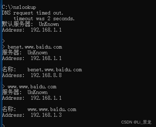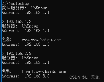 - 查询 DNS 命令:nslookup。输入查询的URL,例如: ww.Baidu。