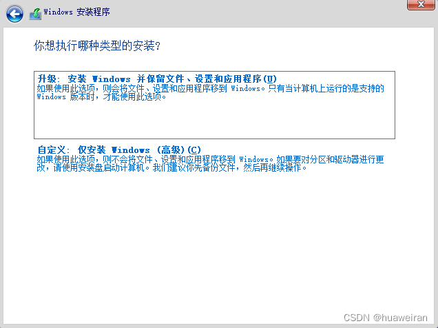 请问你想要执行的安装类型。 这里我们应该根据需要选择第二个选项,即“默认:只安装Windows”选项。