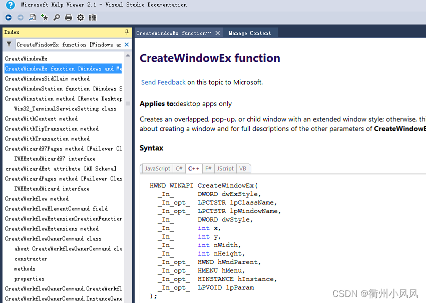 安装选项:Windows Desktop app developemnt,包含所有我想查找的API声明
