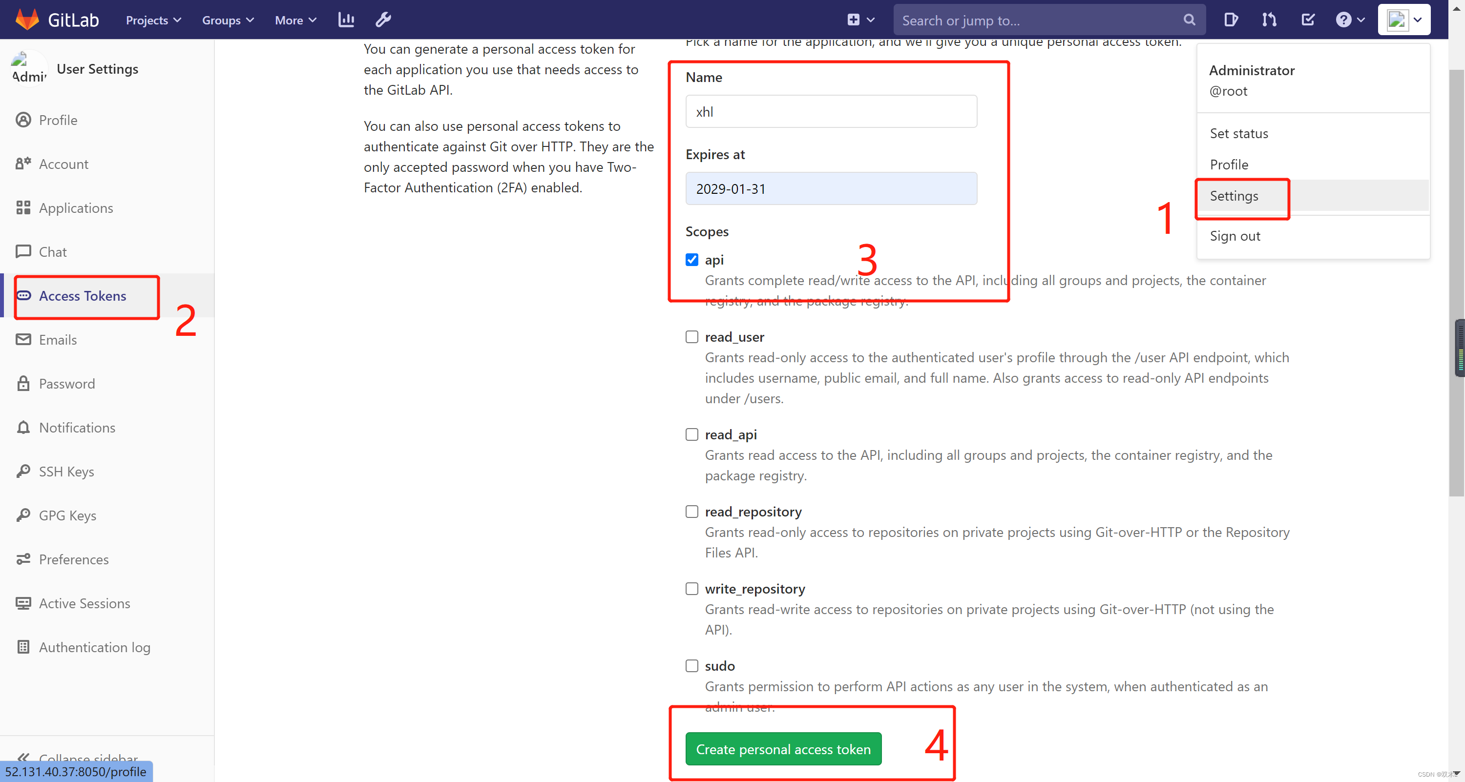 因为我们的詹金斯需要连接所以您需要配置访问トークン,首先在Gitlab上创建访问トークン,然后在Jenkins上配置该トークン