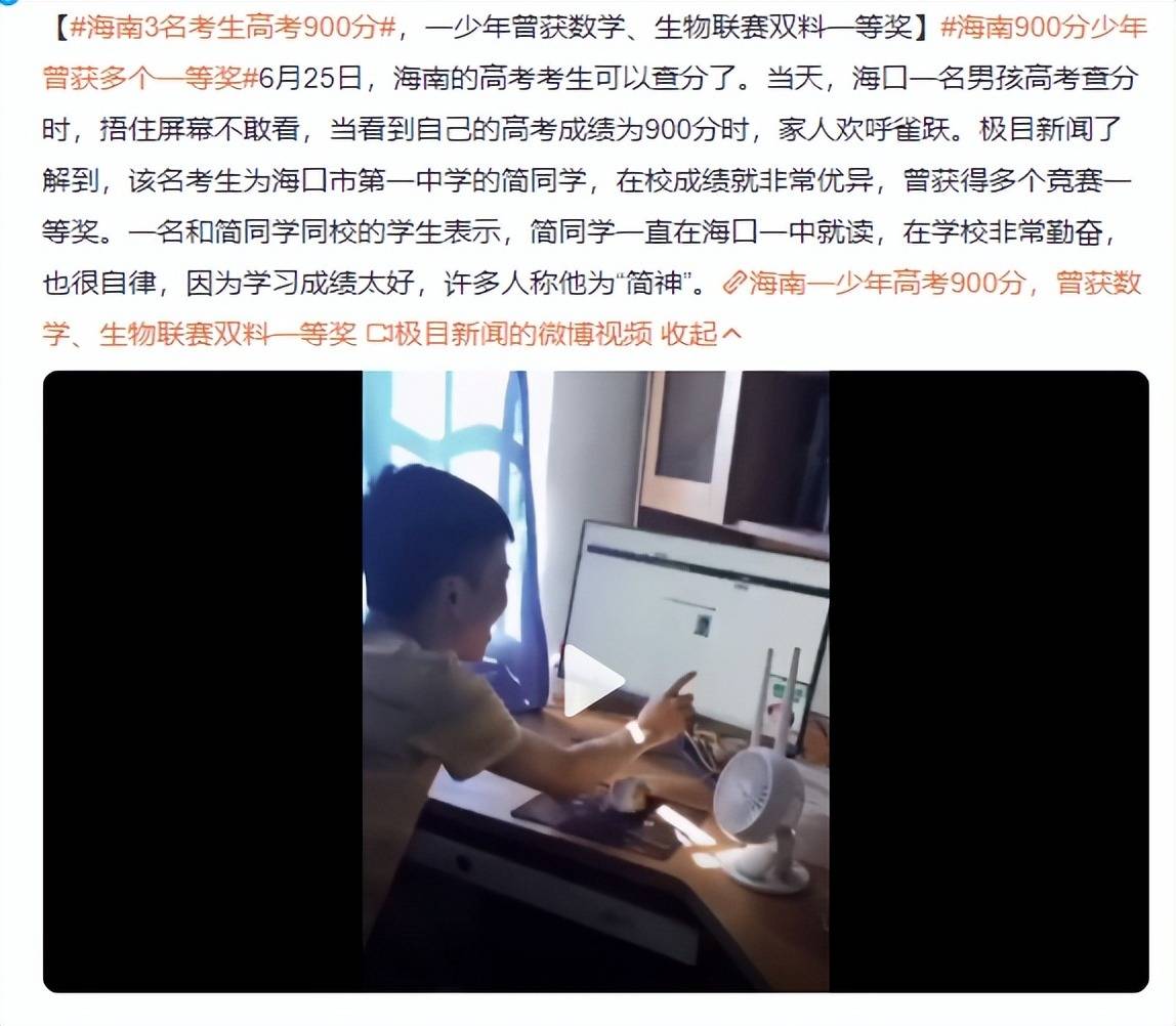 入学考试结果公布后,有无数的题目,有好的入学考试成绩的学生也会成为入学考试的重量。 海南今年有三个学生测试了900分,这是清北学生稳健稳健的!