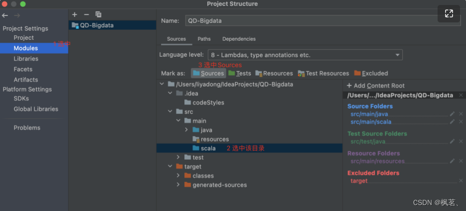 - IDEA左上角--->File--->project structrue--->如下界面: