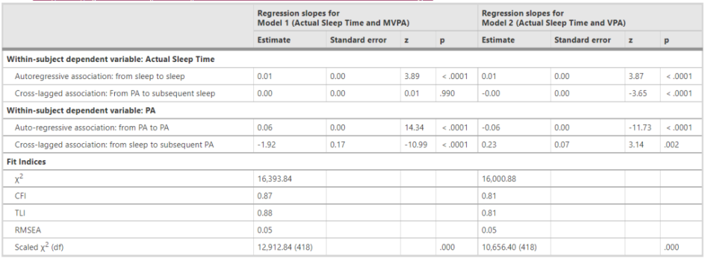 然后,研究人员利用交叉滞后面板数据建模(RI-CPL)分析睡眠与睡眠间的关系,结果表明: