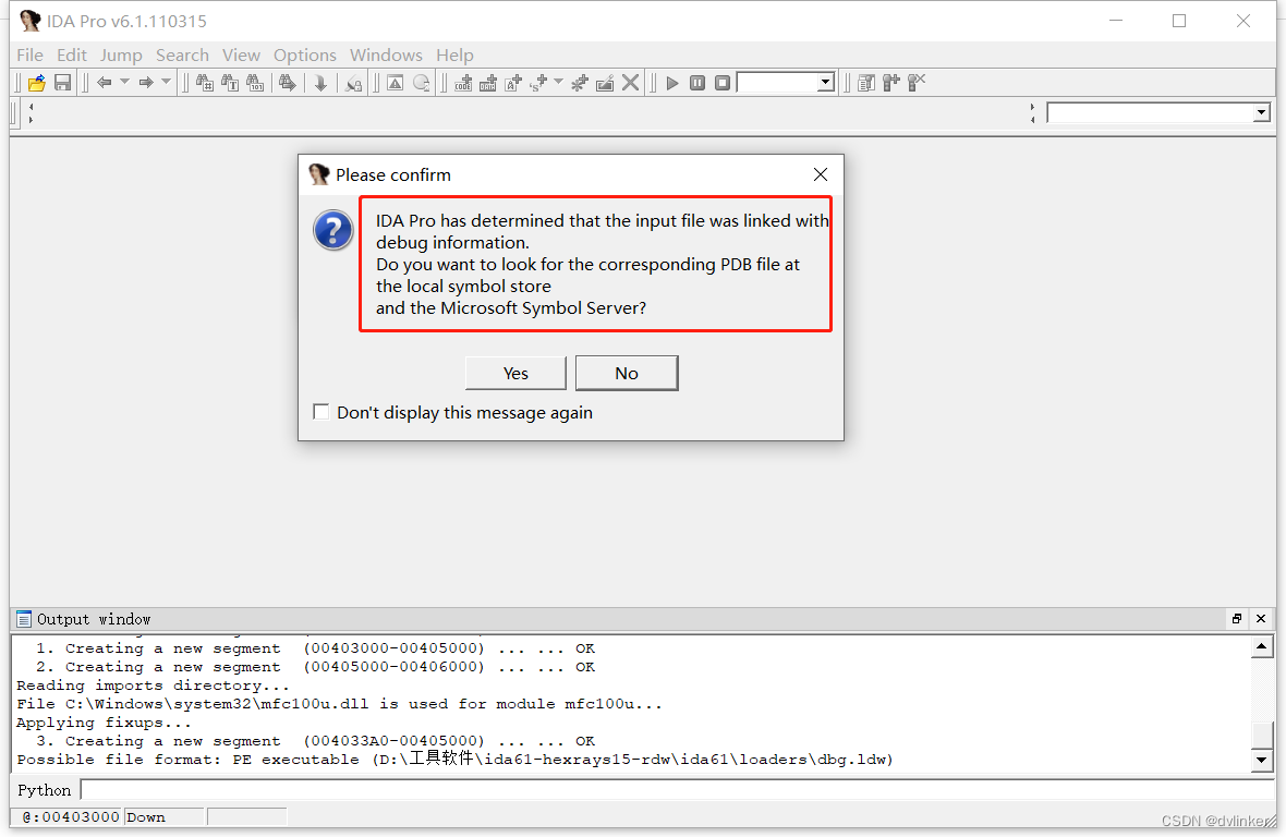 在Windows库中,你可以选择PE模式。 接下来,一个提示会显示是否要下载pdb文件: